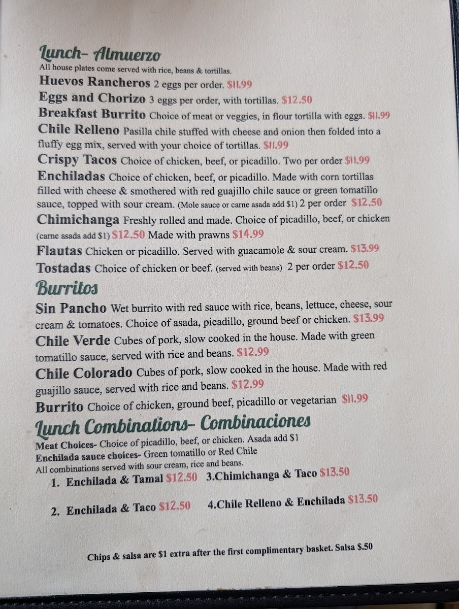 Pieces of pork simmered in a roasted guajillo chile sauce. Served with rice, beans, and tortillas.