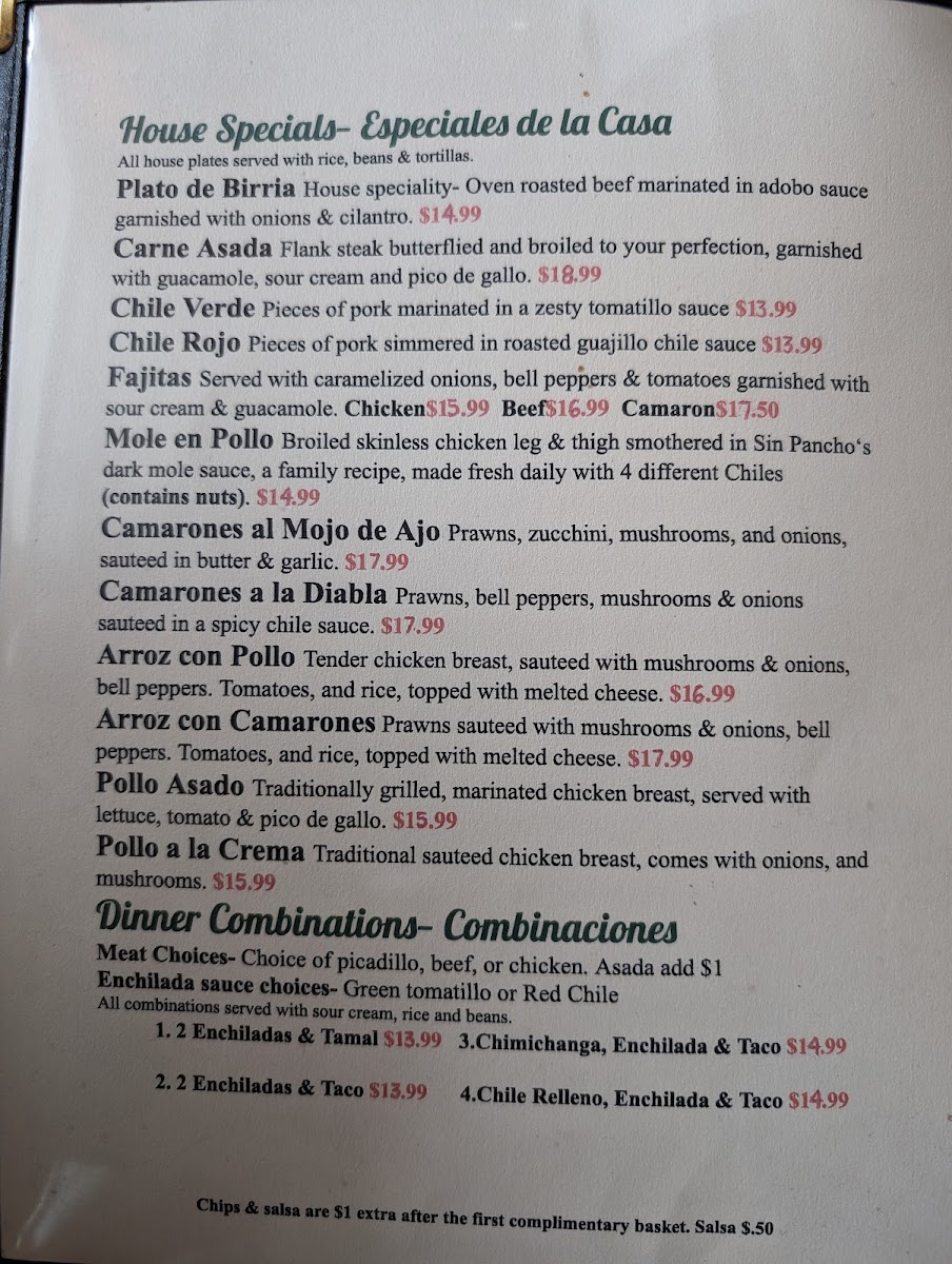 Broiled skinless chicken leg and thigh smothered in Sin Pancho's dark mole sauce, a family recipe, made fresh daily with 4 different Chiles. (contains nuts). Served with rice, beans, and tortillas.
