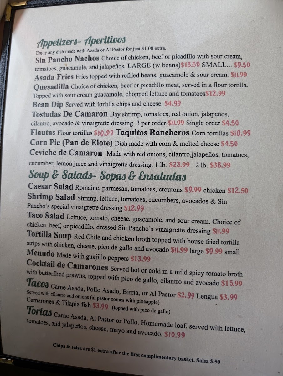 Shrimp, lettuce, tomatoes, cucumbers, avocados & Sin Pancho’s special vinaigrette dressing.